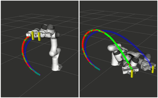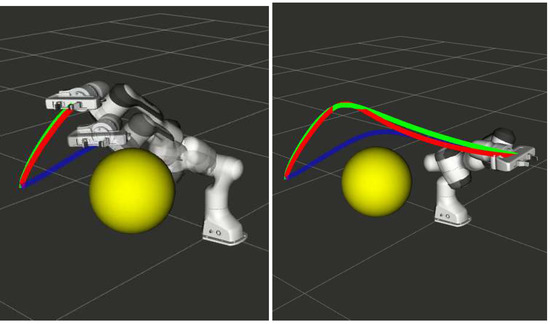 Human–Robot Handover: Algorithm 1 with cost function (14) also finds application in human–robot handover tasks. An example is shown in Figure 3, where the manipulator adapts the prior trajectory (blue) to a new estimate of the handover position. As before, the trajectory obtained with Algorithm 1 is shown in green, while the one shown in red corresponds to a re-solve of the trajectory optimization with warm-start initialization.