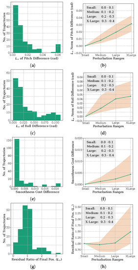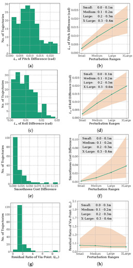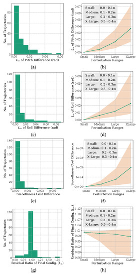 Performance of Algorithm 1 for different perturbation ranges on the benchmark of Figure 1 that involves perturbing the final joint configuration (recall cost function (13)). Note that the perturbation in the final joint is converted to position values by forward kinematics. The (a,c,e,g) column shows the histogram of orientation, smoothness and task residual ratio metrics for the medium range perturbation. The (b,d,f,h) column quantifies the metrics for different perturbation ranges.