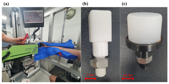 As shown in Figure 2, we used two types of contact probes; one has a shape that causes pain with increasing pressure and the other has a shape that causes pain with increasing force. The first contact probe has a small area such that it can be easily attached to the pressure film sensor, and the pain is not generated by force. The second contact probe has a large contact area such that no pain is caused by pressure. The part in contact with the measurement site is made of elastic rubber so that force is not applied only to a specific area during bending of the human body. The load cell (UMA-K50, Dacell, Cheangiu-Si, Chungcheong buk-Do, South Korea) measures forces along the direction of uniaxial load cell and has a permissible measured force of 500 N. The force sensor was equipped with a contact probe and attached to the end of the algometer. As a product of the I-Scan System (Pressure Mapping Sensor 4041, Tekscan, South Boston, MA, USA), a sensor capable of measuring the contact pressure was used by mounting a film-type pressure sensor. The sensor unit of the film-type pressure sensor was attached to a contact probe for measuring pressure.
