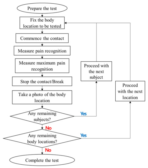 Because pain sensitivity can affect the overall experimental results, the subjects were tested when they were well rested and fed. We strongly recommended sleep for at least 6 h on the previous day. Of course, in practice, the various states of various workers could be estimated, but in this study, it was assumed that the state of not being hungry and taking adequate rest was the most frequent. Additionally, although subjective judgment about pain is unavoidable, to achieve similar measurement conditions for each subject, prior training was performed to enable the subjects to clearly understand the onset of pain and the maximum bearable pain. In the prior training, the experimenter sufficiently explained the concept of pain onset to all subjects. This explanation aimed at enabling them to understand the changing sensations when the feeling of a pressure or force on the skin is converted into pain. In addition, to confirm that the subjects actually understood the onset of pain, a quasi-static contact through a probe was performed on a site other than the target site of the actual trial. The experimenter identified the sensation felt by the subjects with questions and confirmed that they understood the exact onset of pain clearly. In the case of maximum bearable pain, the explanation was sufficiently detailed so that subjects could recognize that the maximum bearable pain level occurred when they felt that it was difficult to endure the pain anymore or felt like it could lead to injury if the trial continues.