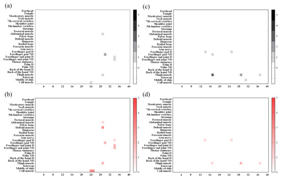 Analyzed heat map results for all subjects. From left to right, the results of the skin reaction (a), skin reaction (b), vascular reaction of the cube-shaped collider (c), and vascular reaction (d) of the cylindrical collider.