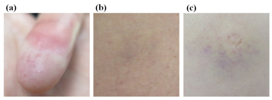 Representative photographs acquired to analyze the degree of skin and vascular reactions. (a) Skin reaction degree 2 (mild erythema)/vascular reaction degree 1 (petechia), (b) Skin reaction degree 3/vascular reaction degree 3 (purpura), (c) Skin reaction degree 0/vascular reaction degree 3 (purpula).