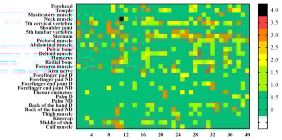 All the body parts for measurement are shown in Figure A1 and Table 3, according to ISO/TS 15066. The red dashed line of Figure 3 marks the middle of the body to help confirm the exact position. In the second process, the first part was randomly selected at each visit of the subject. The sequence after the first part was randomly selected as the part furthest from the previous measurement part. (For example, 1. forehead (No.1) 2. thigh muscle (No.29) 3. deltoid muscle (No.12) …) Depending on the pain of the subjects, the order also changed within the group. The location of each measurement site was selected in consultation with a rehabilitation medical specialist to prevent additional reactions.
