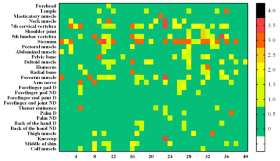 A descriptive statistical analysis of the pain onset and maximum bearable pain was conducted on all 29 body parts tested in the clinical trial. The results are listed in Table 5. The thresholds corresponding to pain onset and maximum bearable pain were divided by force and pressure. The measured pressure and force value distributions varied depending on the characteristics of body parts. The predicted value of the third quartile in Table 6 was calculated by the inverse cumulative distribution function. Because the procedure of calculating the inverse cumulative distribution function entails distribution estimation, the results could compensate for the limited number of samples of 40. In Table 5 and Table 6, “pain tolerance” indicates the threshold for maximum bearable pain.