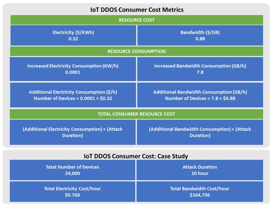 The average cost of electricity and bandwidth in Ghana is estimated at USD 0.32/kWh and USD 0.88/GB, respectively. The assumption is made that 24,000 insecure IoT devices are hacked and used in a DDOS attack for one hour. The combined estimated cost of bandwidth and electricity was found to be around USD 164,800 in just one hour of the attack. For a middle-income country, this could cause a lot of damage to the economy. This implies that IoT devices have to be designed with security as a priority.