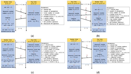 Algorithm flow of HB type lightweight authentication protocols: (a) HB protocol; (b) HB+ protocol; (c) HBMP protocol; (d) HBMP+ protocol.