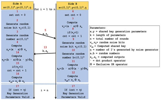 The lightweight key exchange protocol was proposed by Ryoo et al. [16]. The lightweight key exchange protocol is based on the HB family of authentication protocols whose security is dependent on the LPN problem. To generate a shared key between two sides, both of them should have pre-shared parameters x (a k-bit key), y (a k-bit key), ŋ (the number of 1’s generated by a random bit generator), and a counter (cnt) variable. The top-level flow of the proposed key exchange protocol is shown in Figure 3. The key generation takes two simple steps. The first step is the generation of the shared key (Vab) by two entities while the second step is to ensure that both sides have the same shared parameters: x and y.
