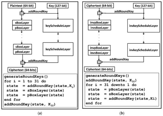Top level description of PRESENT algorithm: (a) PRESENT encryption routine; (b) PRESENT decryption routine.