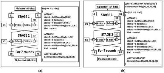 The NEW encryption/decryption algorithm uses the Feistel architecture on a block of 64-bit data and a key length of 128 bit. The cipher uses just eight rounds for the whole encryption/decryption process. It implements the same S-BOX used by the PRESENT cipher. The P-BOX is made up of a one-stage omega permutation network structure. Figure 5a,b illustrate the encryption and decryption routines, respectively.