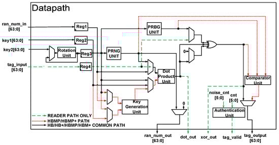 The proposed hardware architecture that combines HB, HB+, HBMP, and HBMP+ lightweight authentication protocols into a single module is shown in Figure 6. The figure is a simplified structure that can be implemented at both the RFID reader and the tag side. This core is capable of authenticating a reader and a tag using 64-bit shared parameters. For simplicity, the figure shows only the datapath. The modules in the datapath include a rotation unit (for key rotation), a PRNG unit (for generating random numbers), a PRBG unit (for generating random bits), a dot product unit (for computing the dot product of the key and random numbers), a comparator unit, a key generation unit, an authentication unit, and four registers. The PRNG unit and PRBG unit are designed using the Linear Feedback Shift Register (LFSR) method. The dot product unit is designed using AND and XOR gates only. The key generation unit and the comparator unit are used by only HBMP and HBMP+ protocols. The Authentication unit is used by only the RFID reader to authenticate the tag. The control unit (not shown in the figure) uses a Finite State Machine (FSM) to generate signals for the modules in the datapath together with select signals for the multiplexors.