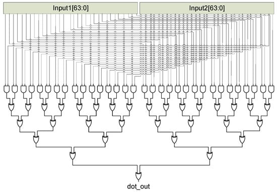 dot product = ⴲ(input1[63:0] & input2[63:0])