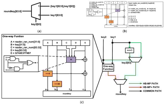 Proposed key generation unit: (a) HBMP round key generation; (b) HBMP+ round key generation; (c) Unified key generation for both HBMP and HBMP+.