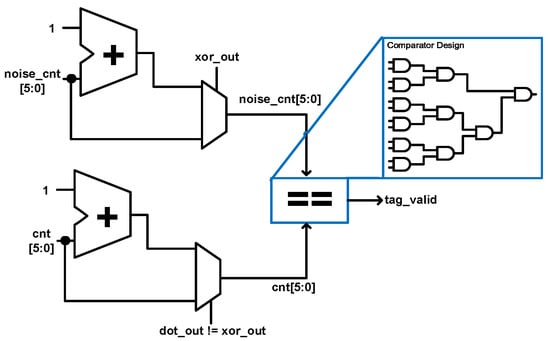 The authentication unit is a simple logic that indicates whether the tag is valid or not after the whole authentication process. It takes as its inputs two 6-bit variables: noise_cnt and cnt. The noise_cnt and cnt values are passed through a comparator and if they are equivalent, the tag is deemed valid, otherwise the tag is deemed invalid. The comparator is designed using only AND gates as shown in Figure 9.