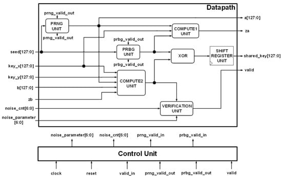 The proposed hardware architecture of the lightweight key exchange protocol is shown in Figure 10. The same hardware architecture can be implemented by all devices wishing to generate a 128-bit shared key. The architecture consists of both a datapath and a control unit. The inputs to the datapath include a 128-bit seed value, a 128-bit key_x, a 128-bit key_y, computed value zb from the communicating partner, 7-bit noise_cnt, and noise_parameter from the control unit. The outputs include a 128-bit random number (a), computed value za, a 128-bit generated shared key (shared_key), and a valid signal. The modules in the datapath include a PRNG unit, a PRBG unit, a COMPUTE1 unit, a COMPUTE2 unit, a VERIFICATION unit, an XOR gate, and a SHIFT REGISTER unit.