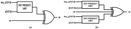 The scaler dot product is used by all HB-type authentication protocols to compute the product of random numbers and secret keys. The dot product unit can be implemented in a number of different ways that typically provide a trade-off between hardware area and latency. With 64-bit inputs, the dot product unit implemented utilizes 32 AND (&) gates and 32 XOR (ⴲ) gates for its computation of Equation (1). Using this method, the dot product of two 64-bit variables is computed in one clock cycle leading to fast computation at the expense of the hardware area. The hardware architecture for this method is shown in Figure 7.