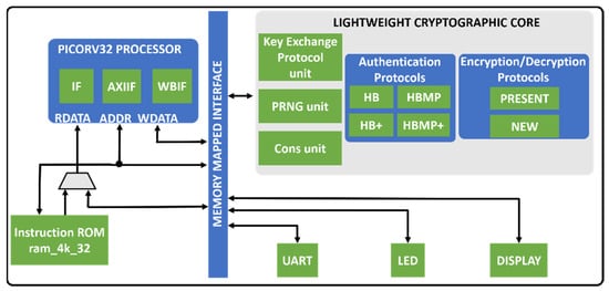 Many lightweight cryptographic protocols proposed for low-cost P2P network devices, which include [25,26,27], do not come with hardware implementations. This makes it difficult to ascertain their suitability for extremely constrained devices. In this section, hardware architectures are proposed for the key exchange protocol, the four authentication protocols (HB, HB+, HBMP, and HBMP+), and the two encryption/decryption protocols (PRESENT and NEW). The hardware architectures are combined into a single lightweight cryptographic SoC with the ability to generate shared keys, authenticate the two entities wishing to communicate, and encrypt/decrypt data for secured communication. The functionality of the lightweight cryptographic core is extended by using a synthesizable RISV-V processor for controlling, scheduling, and reconfiguring the protocols. A Memory-Mapped Interface serves as a bridge between the processor core and the cryptographic engine. Peripherals such as Universal Asynchronous Receiver Transmitter (UART), LEDs, and seven-segment display are used for monitoring control signals from both the cryptographic core and the processor core.