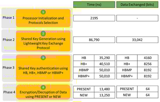The functional simulation flow of the proposed lightweight cryptographic SoC involves a software part and a hardware part. The software part involves the generation of machine code to be loaded into the memory of the hardware part for the processor to execute. The hardware part consists of the integration of the processor core with the cryptographic SoC and memory. Figure 19 shows the simulation results in terms of time and data exchanged between two entities. The simulation frequency is set to 100 MHz. The simulation involves four phases. Phase 1 involves processor initialization and protocol selection. Phase 2 involves shared key generation. Phase 3 involves shared key authentication where HB used the least time and least data exchanged. Phase 4 involves data encryption/decryption where the NEW cipher uses the least time, and both use the same number of data exchanged.