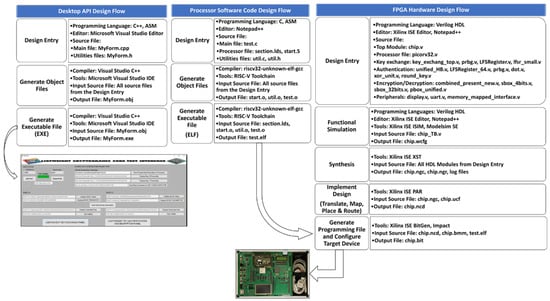 The SoC-based lightweight cryptographic system was verified on an FPGA board using a desktop application. For verification on an FPGA board, three main design flows are used. This includes the FPGA hardware design flow, the processor software code design flow, and a desktop API design flow. The design flows are illustrated in Figure 20.