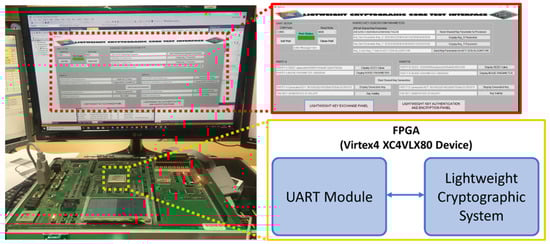 Figure 21 shows the setup used to test the hardware architecture of the proposed lightweight cryptographic SoC. The setup consists of a test board (HBE-SOC-IPD) that is equipped with an FPGA device that implements the proposed SoC, UART for transfer of data to and from the test board, LEDs, and segment display for signal monitoring. The setup also consists of a computer with a desktop application that serves as an interface to the FPGA test board. The desktop application Graphical User Interface (GUI) was designed using Microsoft Visual Studio software.