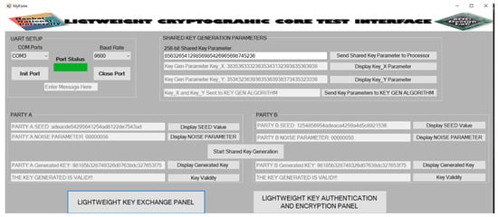 The LIGHTWEIGHT KEY EXCHANGE PANEL is shown in Figure 22. From the figure, the user first connects to the appropriate communication port using the UART SETUP buttons. The user then clicks to display the seed and the noise parameter used at both PARTY A and PARTY B sides. The 256-bit shared key parameter is then entered which is divided into 128-bit Key_X and 128-bit Key_Y. The shared key generation parameters are sent to the key generation algorithm. The Start Shared Key Generation button is then clicked to begin the key generation process at PARTY A and PARTY B. The Display Generated Key buttons at both PARTY A and PARTY B are clicked to show the shared key generated by the lightweight key exchange protocol. The Key Validity buttons at both PARTY A and PARTY B are clicked to determine whether or not the generated shared keys are equivalent. From the figure, the Key Validity indicates that the shared keys generated at both PARTY A and PARTY B match.