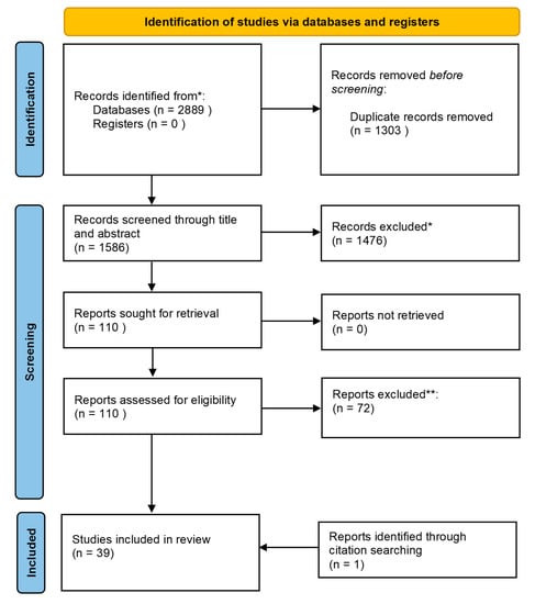 A total of 2889 articles were retrieved, resulting in a total number of 39 articles included in this review after the screening process (Figure 1). After the initial search (5 August 2020), removal of duplicates, screening of titles, and abstract and screening of full-texts, thirty articles were included (Supplementary Material, Figure S1). After performing the search a second time (31 May 2021), eight new articles were identified (Supplementary Material, Figure S1). One article was identified through citation searching.