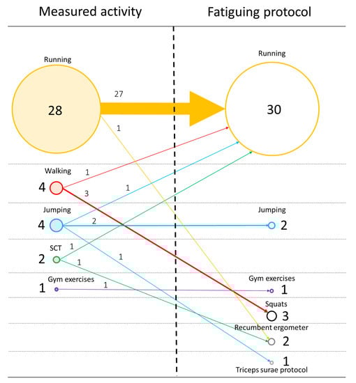 Summary of fatiguing protocols and measured activities. Circles on the left side represent the number of articles that measured each PE activity, while circles on the right side represent the number of articles for each PE activity chosen as a fatiguing protocol. Horizontal arrows represent the articles that used the same fatiguing protocol PE activity as the measured activity, while diagonal arrows represent the articles that chose a different PE activity.