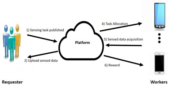 The mobile crowd-sensing mechanism consists of three components: the service requester, platform and workers. The entity that requires the results of the sensing tasks is known as the sensing task requester. Participants are smartphone employees compensated for their contributions and have the requisite sensors to execute the sensing duties. The platform’s purpose is to broadcast task requirements to available participants, such as sensing time, reward, and location, to recruit the best participants for each job, and ultimately to collect and deliver the sensed data to the platform [,].