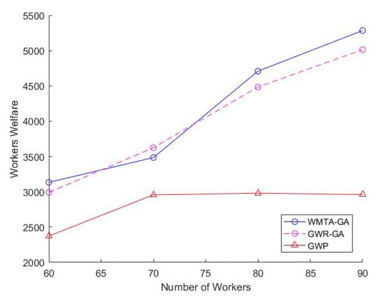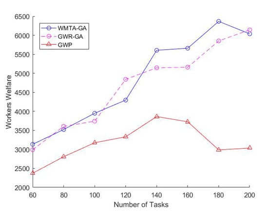 In this section, we introduce the experimental design used to analyze the proposed WMTA-GA algorithm. In the experiment, we assumed that both the number of sensing tasks and the number of workers range from 60 to 200. The maximum number of iterations (i.e., the maximum generation ) and the population size is set to 150 and 20, respectively. The worker’s working time ranges from 1 to 50 (min), and the response time of the task ranges from 1 to 20 (min). The sensing area is divided into 100 locations, and the position of both the worker and task are randomly selected from one of the locations. We assume that the velocity of the worker is 50 km/h and the total budget allocated to the platform is 15,000. The willing threshold for each task is randomly selected from the range [0.1 to 0.7]. The sensing cost of the workers is within the range [100, 400]. The experiment was conducted using MatLab 2016a.