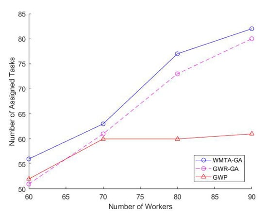 - Impact of Varying Number of WorkersWe investigate how varying the number of workers affects worker welfare, the number of task allocations, and the average performance of the workers. We set the range of workers from 60 to 90 and fixed the number of tasks to 200. In Figure 4, we observe that as the number of workers increases, the workers’ welfare increases as well. The workers’ welfare in WMTA-GA steadily increases compared to the other approaches. For example, when the number of workers ranges from 60 to 80, WMTA-GAs’ worker welfare is 3100 and 5300.In Figure 5, we see that WMTA-GA provides the highest number of assigned tasks as compared to the other algorithms. When the number of workers is 60 and 80, WMTA-GA achieves 56 and 77 number of the assigned tasks.The number of the assigned tasks increases as more tasks are successfully allocated, as observed in Figure 5. The WMTA-GA approach had the highest number of assigned tasks compared to other approaches for n = 60 to 90, with the highest recorded number of assigned tasks of 84 at . GWR-GA follows the same trend as WMTA-GA because it achieved a similar result to WMTA-GA. However, GWP had the lowest overall number of assigned tasks and peaked at 68 assigned tasks at .We observed from Table 3 that WMTA-GA has the best average performance as compared to GWR-GA and GWP, which is indicated by their average utility values. WMTA-GA’s average utility value is 17.26% more than GWP, and 1.98% more than GWR-GA. The second-best performing algorithm is GWR-GA, with an average utility value higher than GWP by 15 percent. Compared to WMTA-GA and GWR-GA, the GWP had a minor favourable result, with an average performance of −15% and −13.3% for WMTA-GA and GWR-GA, respectively.