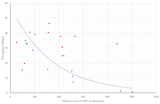 The distance that the BPL signal must travel is one of the most important parameters that will affect the resulting communication. According to simulation and real measurements, BPL communication can be expected in tens of Mbps up to a distance of 600 m [26,33,34] for underground MV power lines. The distances between distribution transformer stations (DTS) are mostly in the range of tens of meters to the higher hundreds of meters for power grids in the Czech Republic. As shown in Figure 1, the field measurements of BPL throughput for point-to-point connection without repeaters has an exponential declining trend for underground MV power lines without branches. In the picture, there are blue dots that are near the curve which, with their predispositions, correspond with the approximate communication throughput concerning the given distance. However, the dots marked in red are too far from the curve, so it is necessary to investigate why. This could be, for example, due to a bad cable, a faulty cable cross section, or a cable joint with pervaded moisture.