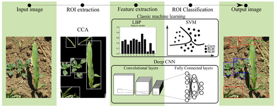 Classification is the task of predicting the class of given data. However, a large dataset is required to perform this assignment; therefore, in this work, an experimental image dataset was built, and it is detailed in Section 2.1. As Figure 1 shows, the proposed classification process considers five steps. First, images of the field, in natural conditions, are acquired. Then, these images are segmented and enhanced by classic image processing techniques before reaching the second stage. In a second stage, the regions of interest (ROI) in the segmented image are extracted utilizing CCA [35,36].