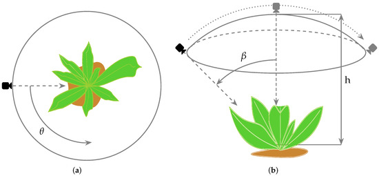 Figure 2 shows the locations of the camera that were used to capture the images; where is the rotational position of the camera respect the target (Figure 2a), and angle is the lateral orientation of the camera (Figure 2b). When , the top-down camera view is obtained. On the other hand, h is the distance between the camera and the target base, which took a maximum value of around 1.50 m and a minimum one necessary for capturing either a corn plant or weed.