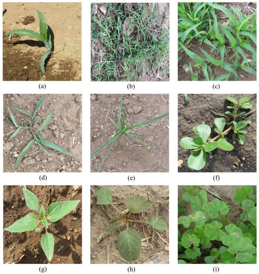 The image acquisition process was performed every five days; as a result, corn and weed plants were of 2–7 leaves in our dataset. This dataset also introduced sunlight variability since the images were collected on sunny and cloudy days. The images were of size pixels, captured using a Canon PowerShot Sx60HS 16.1-megapixel camera. The gross dataset was integrated by nine plant species, which are presented in Figure 3.