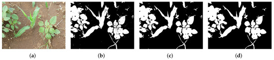 Segmentation in this color space was reported to be upstanding because the color (hue channel) is not correlated with the brightness (value channel), which is better for greenness identification [41]. The resulting image, , is used to remove the background, this is done using a thresholding function, , and it is defined by Equation (1).