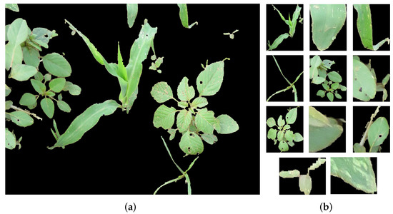 Therefore, once objects were located in the final binary image, individual objects were extracted from the RGB input image, as shown in Figure 5. Subsequently, the plants were manually classified into the classes Crop, NLW, and BLW to build the experimental dataset for training the models. Table 1 depicts the plant species that integrates this dataset, where, 5080 images integrated each class; furthermore, the plant species inside NLW and BLW were also balanced.