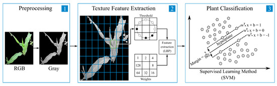 The rotation-invariant uniform local binary pattern () operator, presented in Ojala et al. [39], was implemented for extracting texture features of the plants under study for their further classification. In addition, as mentioned, the main characteristics of this operator are its monotonic gray-scale transformation, illumination, and rotation invariance [25].