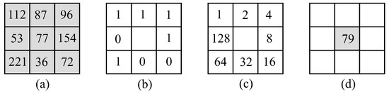 Figure 7 describes the process for calculating the LBP code of a gray-scale image window. First, the intensity of the center pixel () is compared with the intensity of each of the eight surrounding pixels () (Figure 7a); when the difference value of () is greater than 0, it is considered to be 1; otherwise, it is considered to be 0. From this process, an 8-bit binary pattern is obtained, that in this case is 11110010, as shown in Figure 7b. The weights of Figure 7c are calculated by the operation , wich is a factor of Equation (6). Then, the binary pattern (Figure 7b is element-wise multiplied by the weights (Figure 7c, and the products summed to obtain a LBP code, which in this case is 79. Finally, this LBP code is replaced by the central pixel of the window (Figure 7d).