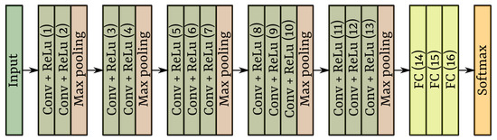 The VGG architectures, also called Visual Geometry Group, are integrated by two and three consecutive convolutional layers followed by a max-pooling layer. The convolutional operations use size ReLu kernels. These kernels are smaller than those implied in other CNNs proposed before the epoch they were launched, which usually use , and kernel size. In the convolutional layers, the stride is fixed to 1 pixel, and the padding is also of 1 to conserve the spatial resolution of input data. The advantage of the small-size filters is that they are equally efficient extracting features than those large-size-filters; additionally, the number of parameters is reduced, then the computational cost is reduced as well [46]. Respect max-pooling layers of these networks, they use size kernels with a stride of 2.