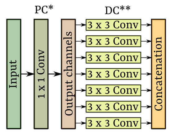 Therefore, an Xception module, similar to the Inception module, first executes PC to map cross-channel correlations and then maps the spatial correlation of each output channel through DC. Nonetheless, the Xception module integrates a single convolution as PC. To better visualize this concept, a module of the Xception network is shown in Figure 9. Additionally, similar to DSC, Xception does not include any activation functions among PC and DC. The idea of Xception is to reduce computational cost and preserve the number of parameters, like in Inception.