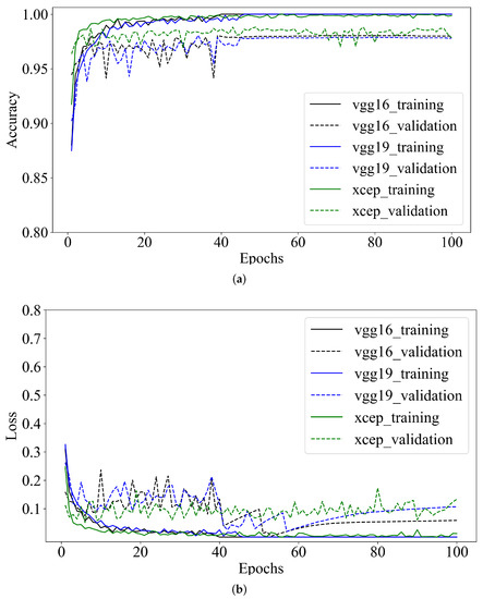 For the reason that VGG16, VGG19 [37] and Xception [38] CNN models have shown excellent performance in the plant classification tasks [23,34,49], in this work, they were evaluated for weed classification in natural field conditions. Another reason for the use of the VGG16 network is that it provides high performance concerning the accuracy, even when it is trained with a dataset with a small number of images [50].