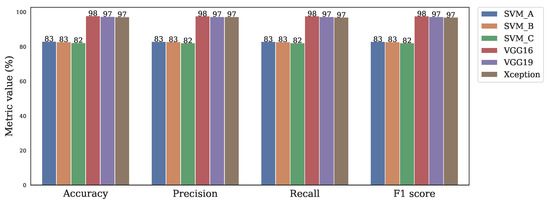 In this section, the results obtained from applying both classification approaches, SVM- based classical machine learning (Section 2.2.1) and CNN (Section 2.2.2) are presented. It is worth mentioning that both approaches were trained with the built experimental database, which, as already mentioned, consists of 5080 images for each of the three analyzed classes.
