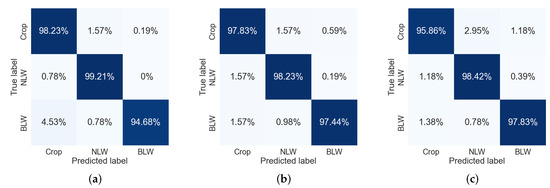In the same way, the reality in the control of weeds, when a crop is already established, is the use of selective herbicides for NLW or BLW [54]. This could be a drawback for those models trained to classify single plant species. Therefore, we consider that our best SVM model gave an acceptable accuracy , considering the variability in our dataset and because the plant species were grouped into the classes crop, NLW, and BLW. In this case, the SVM model had to learn the complexity of the features that come from each of the distinct plant species and relate them into a single class, making the classification a complex task.
