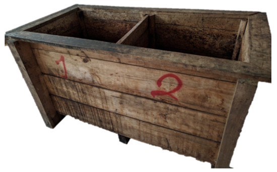 A wooden sweatbox (with 2 slots) used in the cocoa fermentation step.