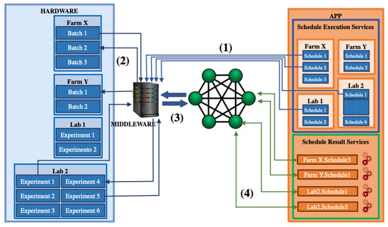 Its distributed architecture is composed of four modules (see Figure 2 in Section 2): Hardware, Middleware, Blockchain, and Application. The Application module sends request messages, defined in the process schedule, to the Middleware, which manipulates such information and forwards it to the Hardware module, composed of sensors and actuators that will perform the schedule tasks and send back the result of such operations to the Middleware. This module sends such information to smart contracts (created by the Application and stored in the Blockchain). Finally, Application users will be able to visualize the generated reports and to access the Blockchain to manipulate the data stored in its smart contracts.
