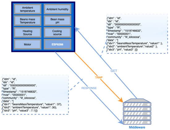 In this figure, we can see the Middleware sending a GET message to the Hardware to request some sensors’ values (e.g., ambient temperature, bean mass temperature and pH), and the RESPONSE message sent back from the Hardware to the Middleware, with the requested data (this information will be, afterwards, sent to the Blockchain, to be securely stored on its smart contract(s)). In addition, we can observe, in Figure 3, the special TRAP message (highlighted in orange) that occurs when Hardware elements detect a data modification and automatically send such information to the Middleware, without the need to receive a GET message to perform such task.