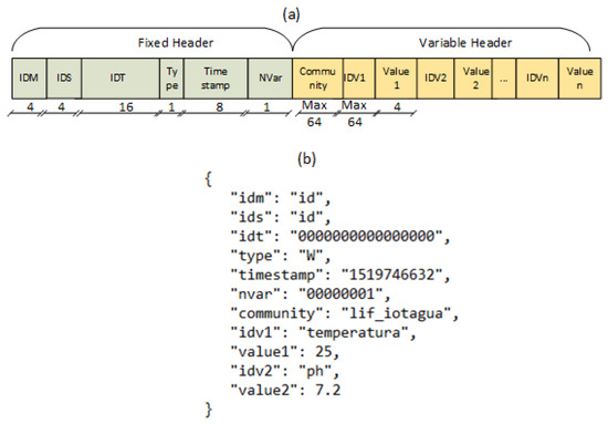 (a) Message format; (b) example of an IoTCocoa JSON message pattern.