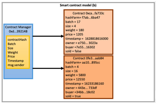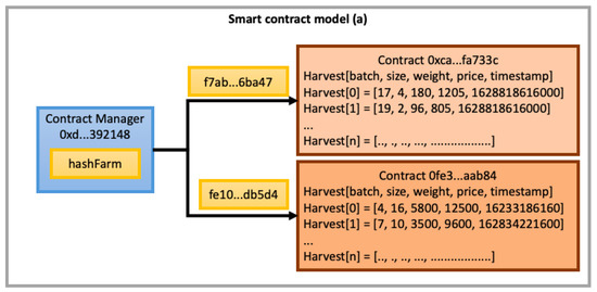 In (b), smart contracts are used to build IoT-based automation and control systems, eliminating the trusted third party [43]. Many enterprises provide this kind of service, such as LeewayHertz, which provides solutions for IoT companies and startups interested in operating smart contracts on the Ethereum blockchain [44], and Ecotrace, which uses IoT, artificial intelligence, and the Hyperledger blockchain for tracking food supply chain [45].