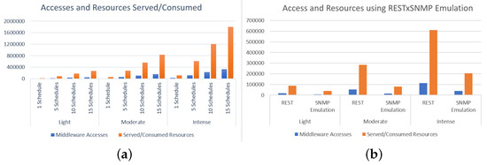 In (a), sensors and actuators are electronically represented by instantiable classes. Each of these classes has variables representing the values to be monitored in the process. In (b), REST interfaces are created based on SNMP messages (to be discussed in the next paragraph), in such a way to effectively manage the network traffic from the application service layer (alternative adopted in [34,35]). Classes in (c) perform database read/write tasks taking into account the information sent by Hardware sensors, or coming from the Application.
