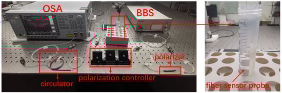 The experimental setup for SRI measurement is composed of a BBS (Golight, ASE C+L LIGHT SOURCE, Shenzhen, China), a polarizer, a polarization controller, a circulator, a fiber sensor probe, and a OSA (Anritsu, MS9740A, Atsugi, Japan), as shown in Figure 1a. The input state of polarization was adjusted to generate a P-polarized spectrum with a SPR signature. The SRI measurement was conducted by immersing the probe in glucose aqueous solutions (refractive index ~1.3573) with small refractive index changes of the order of ~10−5. The reflected spectrum of the TFBG in P-polarization to investigate in the range from 1520 nm to 1620 nm is shown in Figure 1b with a SPR signature situated at ~1557 nm. The peak situated rightmost in this figure is pertinent to the core mode, which could be used for temperature compensation, while the comb-like spectral fluctuations situated to the left of the core-mode reflection peak is due to the couplings between the core mode and the cladding modes. The real experimental set-up is displayed in Figure 2.