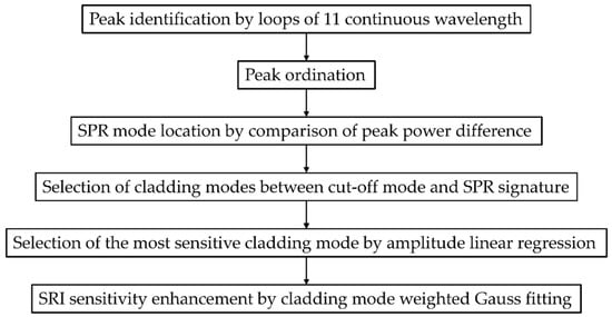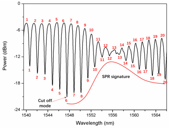 After peak ordination, the SPR signature is located by the following two steps. First, power differences between max-peaks and min-peaks with the same serial numbers were calculated. Second, by comparison the minimal power difference was obtained, which belongs to the SPR mode with serial number 13. The area around the SPR mode is defined as the SPR signature [8,15]. Meanwhile, the cut-off mode located to the blue side of the SPR mode was identified by searching the lowest amplitude of the cladding mode, which has a serial number of 6. Thus, the cladding modes of most interest (No. 7–No. 12), sandwiched between the cut-off mode and the SPR signature, were adopted for the SRI measurement, as illustrated in Figure 5.